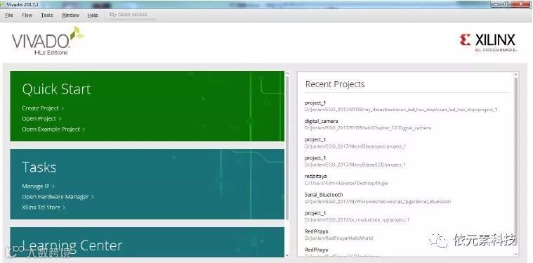 本实验使用Vivado 2017.1 进行开发,开发界面如下。如果您未安装vivado,安装流程请点击这里。