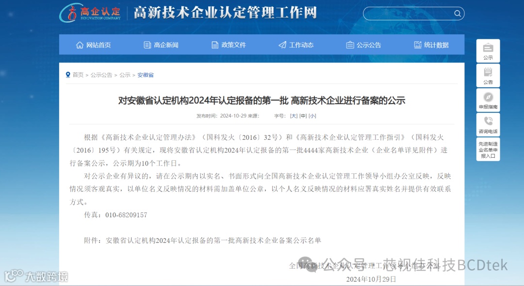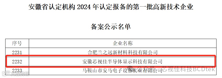 2024年10月29日,高新技术企业认定管理工作网对安徽省认定机构2024年认定报备的第一批高新技术企业进行备案公示,经公司申报、地方初审、专家审查、网站公示等严格的申报程序,安徽芯视佳半导体显示科技有限公司顺利通过“高新技术企业”认定。