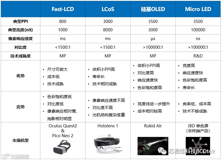 AR/VR微显示领域可供选择的技术包括Micro LED、硅基OLED、Fast-LCD、LCoS等。Micro LED目前尚无法实现量产,硅基OLED相比其他技术具备快速响应、高分辨率、高对比度、低功耗、大视角等明显的优势(具体对比见下表),由于当前成本较高、产能有限,市场普及率还有待提升。