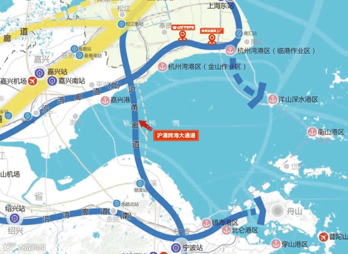 上海到杭州湾新区的主要交通走廊包含沪甬通道,沪甬跨海大通道是上海市与浙江省宁波市之间直连直达的跨海通道,采用G15杭州湾二桥(沈海高速公路杭州湾二桥)、沪甬城际铁路合建的模式,总里程70公里(跨海段全桥长48公里),总投资1000亿元。该通道拟布置于杭州湾跨海大桥以东约20—40公里的杭州湾海域,北岸登陆点为上海金山,南岸登陆点为宁波慈溪。