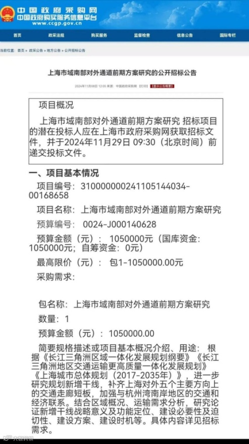 近日,上海市交通委发布《上海市域南部对外通道前期方案研究》公开招标。