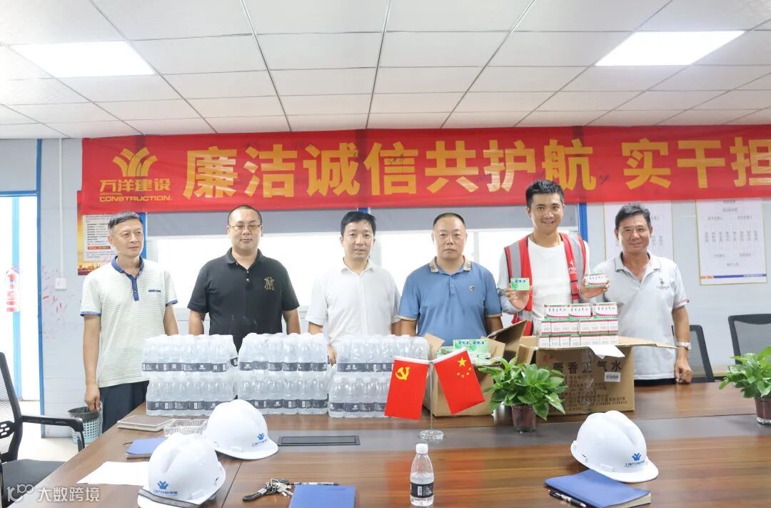 近日气温持续攀升,连续“烧烤”模式,给从事高强度工作的一线施工人员带来了严峻考验,为确保施工人员身体健康,以高昂的斗志投入工作。7月13日下午,上海万洋科技城副总经理周金志带队,为项目一线施工人员送来了矿泉水及防暑降温的药品,慰问酷暑中仍坚持工作的一线施工人员。