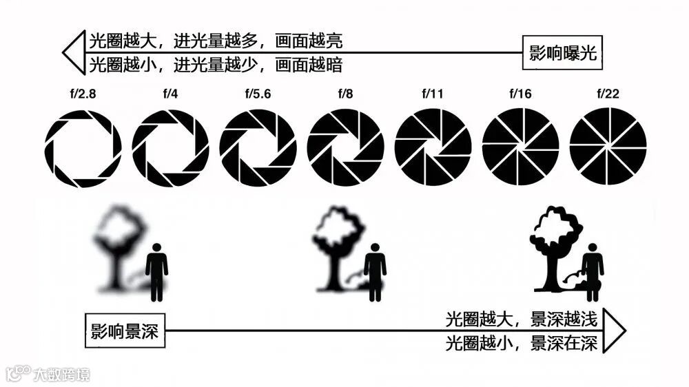 光圈越大(f值越小,如f/2.8),景深越浅,背景虚化越明显。