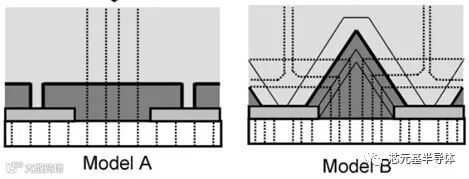 芯元基的DPSS衬底就相当于京瓷二次生长前的硅基板,仅需一次外延,成本优势明显,京瓷的二次外延生长会带来外延表面particle增加,降低表面良率和增加外延生长时间。京瓷采用下图Model A的生长方式位错在窗口延伸,芯元基采用Model B的生长方式位错弯曲合并最后仅存在合拢面上方。