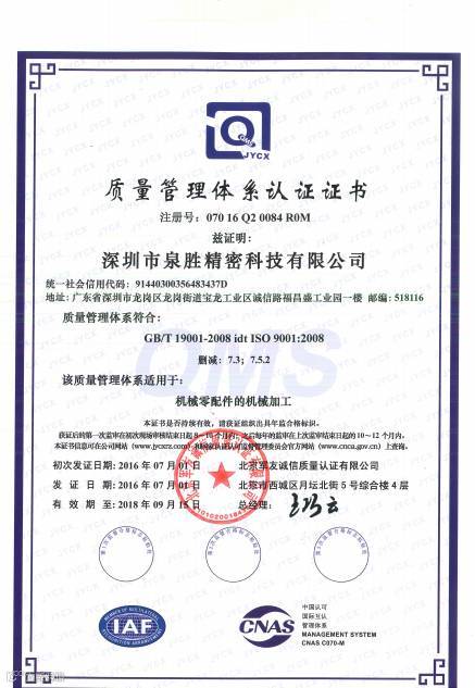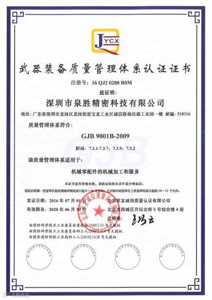 深圳市泉胜精密科技有限公司通过“国军标质量管理体系”认证,并由北京军友诚信质量认证有限公司颁发《质量管理体系认证证书》与《武器装备质量管理体系认证证书》。