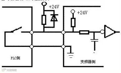当输进开关信号进进变频器时,有时会发生外部电源和变频器控制电源(DC24V)之间的串扰。正确的连接是利用PLC电源,将外部晶体管的集电极经过二极管接到PLC。如图4所示。