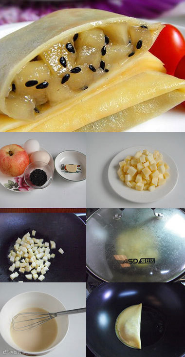 4:要在蛋皮表面刚凝固的时候铺上苹果,这样才能把对折后的蛋皮牢固的粘合。