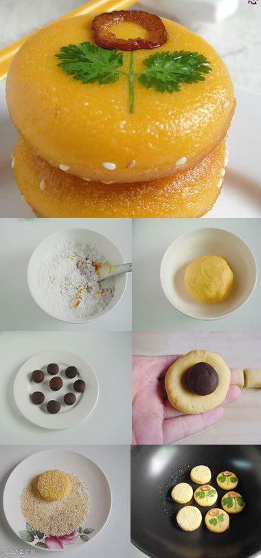 4:南瓜饼别做太大,太大的里面不容易煎熟。而且揉南瓜面团的时候要揉得光滑点,这样做出来的成品特别美观。