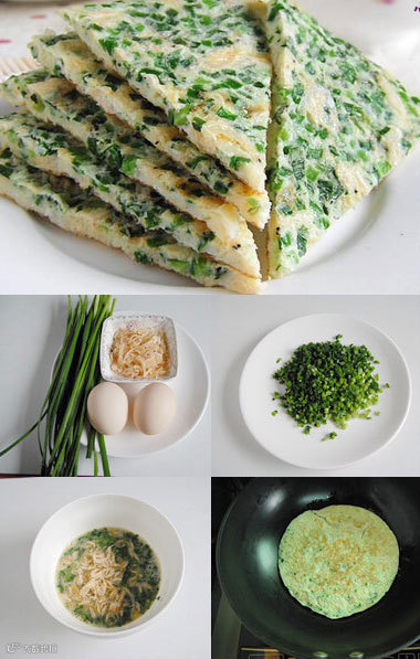 韭菜虾米蛋饼配上一碗白米粥,方便快捷,营养丰富。