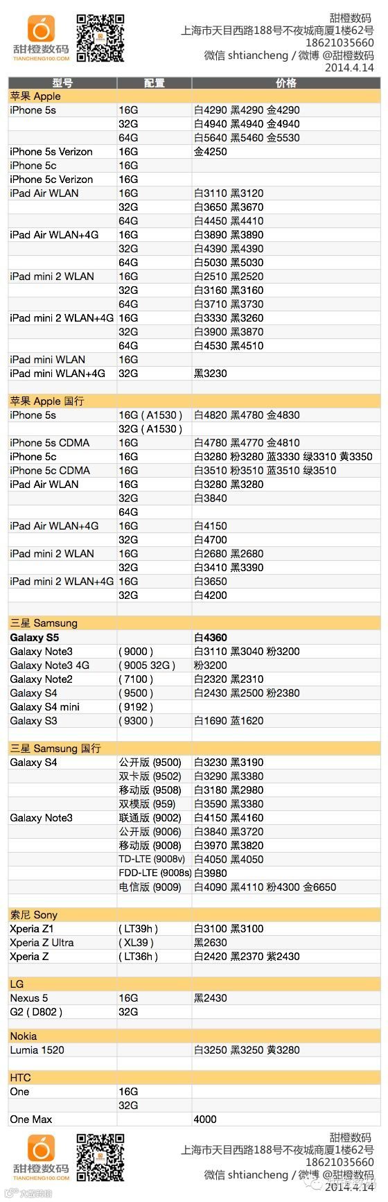 企夯科技甜橙数码三星 Galaxy S5 到货,想尝鲜的朋友可以关注起来了;和 Galaxy S5 价位相近的 Galaxy Note3 稍微下跌,而由于不满新机或对新机高价望而却步的用户可能会重回 Galaxy S4,所以 S4 价格依旧坚挺;iPhone 5s 稳定。