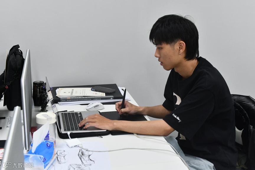 工作室里,工业产品设计研究方向的研二学生廖佳威在苦思冥想。和贡倩一样,他参与了去年的比赛,由于是“单打独斗”,再加上学习任务重,时间紧张,他最终止步于二十强。赛后,廖佳威与贡倩进行了经验交流,从前期调研、灵感探索再到车型的造型语言和典型特征,从应用场景、功能延伸再到渲染软件的使用操作,两人都进行了细致的复盘。
