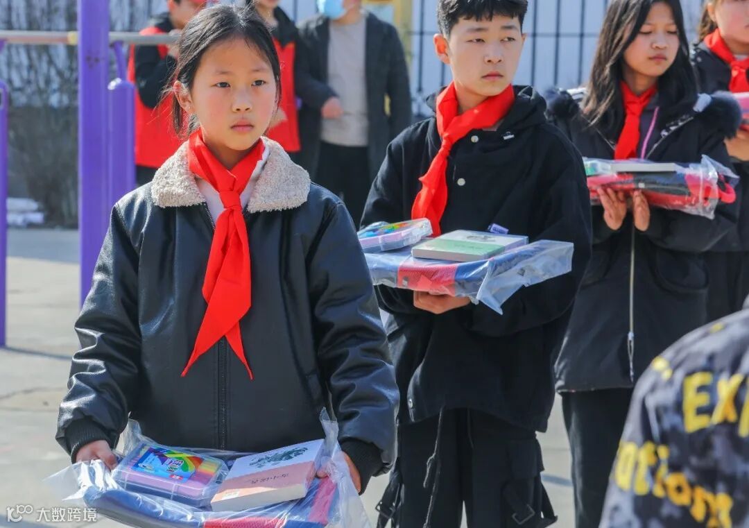 在向阳小学,企业送来了学校急需的彩色打印机、投影仪等设备,每位孩子都收到了书包、水彩笔等学习用品。小朋友们为参加志愿服务的叔叔阿姨们系上红领巾,还为叔叔阿姨们做了才艺表演。