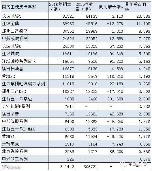 同时,2016年国内多数皮卡企业均保持销量增长的趋势,其中郑州日产的皮卡销量增长速度最快。与此同时,2016年国内部分老牌皮卡企业的销量也出现了不同程度的下滑。