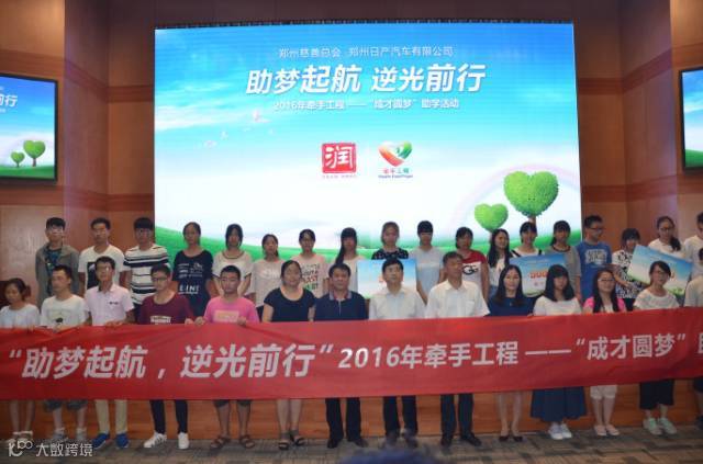8月19日,“助梦起航,逆光前行”郑州日产2016年牵手工程“成才圆梦”助学活动在郑州日产研发中心隆重举行。郑州日产党委副书记鲁文澍、郑州市政府副秘书长、郑州慈善总会顾问赵红军出席活动。152名优秀大学生接受郑州日产捐赠的每人5000元助学金,这也标志着郑州日产2016年牵手工程“成才圆梦”计划正式启动。