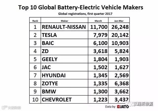 据《福布斯》杂志报道,来自于独立数据提供商JATO Dynamics公司的信息显示,2017第一季度纯电动乘用车制造商排名:1、雷诺-日产。2、特斯拉。3、北汽。4、ZD。5、吉利。6、江淮汽车。7、现代。8、众泰。9、宝马。10、雪佛兰