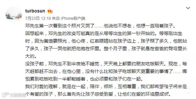 孙俪曾发文:“没孩子前,邓先生不到半夜绝不睡觉,天天晚上都要约朋友吃饭聊天。现在,每天赶都赶不出去,在他心里,没有什么比和孩子吃饭聊天更重要的事情了。”