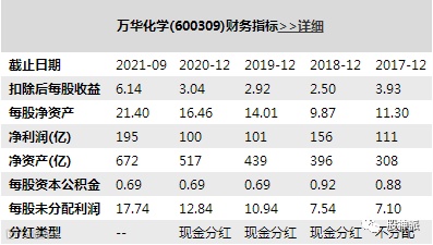 2021年1-9月,万华化学(600309)营业收入1073.2亿,同比增长118%(2020年1-9月为492.3亿),净利润195.4亿元,同比增长265.3%(2020年1-9月为53.5亿元),每股收益6.22元,其中2021Q3营业收入396.6亿营业收入363.3亿,环比2021Q2增长9.2%,2021Q3净利润60.1亿元。 万华化学发布2021年业绩预增公告,根据财务部门初步测算,归属于上市公司股东的扣除非经常性损益的净利润为240亿元到252亿元,与上年同期相比,增加145亿元到157亿元,同比增加152%到165%。
