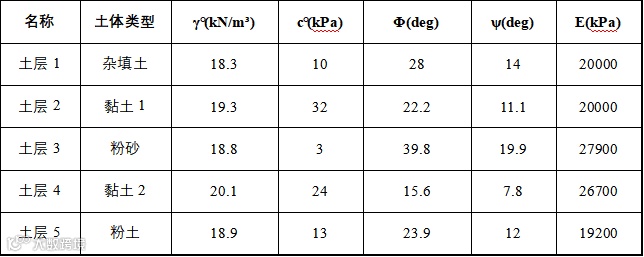 GFE中土体采用C3D4单元,地连墙采用S3单元,支撑采用B31单元,为便于对比,本案例中各土层均采用摩尔-库仑本构,各土体参数如下表1所示。