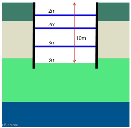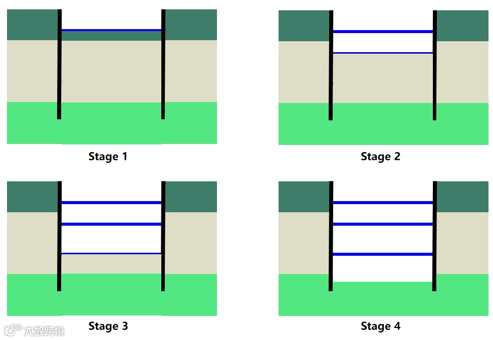本案例基坑长度约10m,宽度约6m,开挖深度10m,基坑采用地连墙以及多道内支撑组成的支护结构体系,示意图如图1所示,基坑开挖主要施工步骤如图2所示。