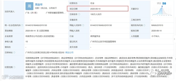 快乐方程式茶饮品牌关联公司为广州新锐餐饮管理有限公司,该公司成立于2020年8月,注册资本100万,由周成和周金年共同持股,成立距今不过才一年左右的时间。