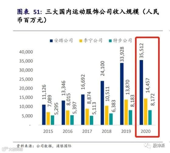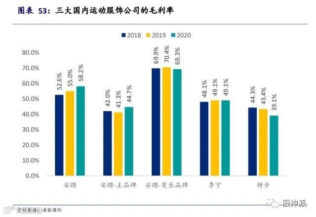 2020年安踏营业收入为356亿左右。安踏公司的毛利率在 2020 年达到了 58.2%,高于李宁的 49.1%和特步的39.1%