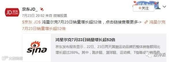 于是网民开始了“兽性消费”,直接卖空直播间,京东微博发文,目前鸿星尔克23日当日销售额同比增长超52倍。