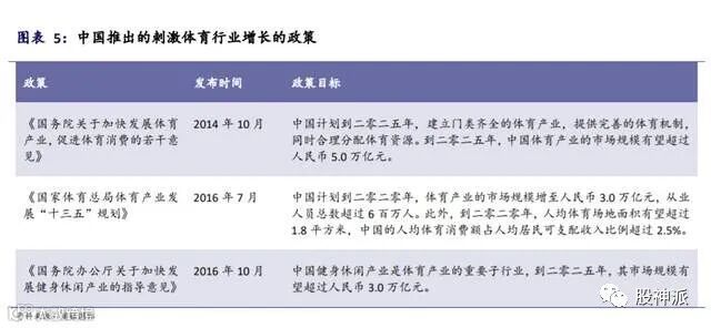 中国自从 2014 年以来颁布了一系列支持中国体育产业的政策。这些政策强调了体育产业对国民经济的重要性,鼓励对体育产业进行投资,推广全民健身以及专业体育服务,大力地促进了中国体育行业的发展,也激发了民众对体育运动的热情。