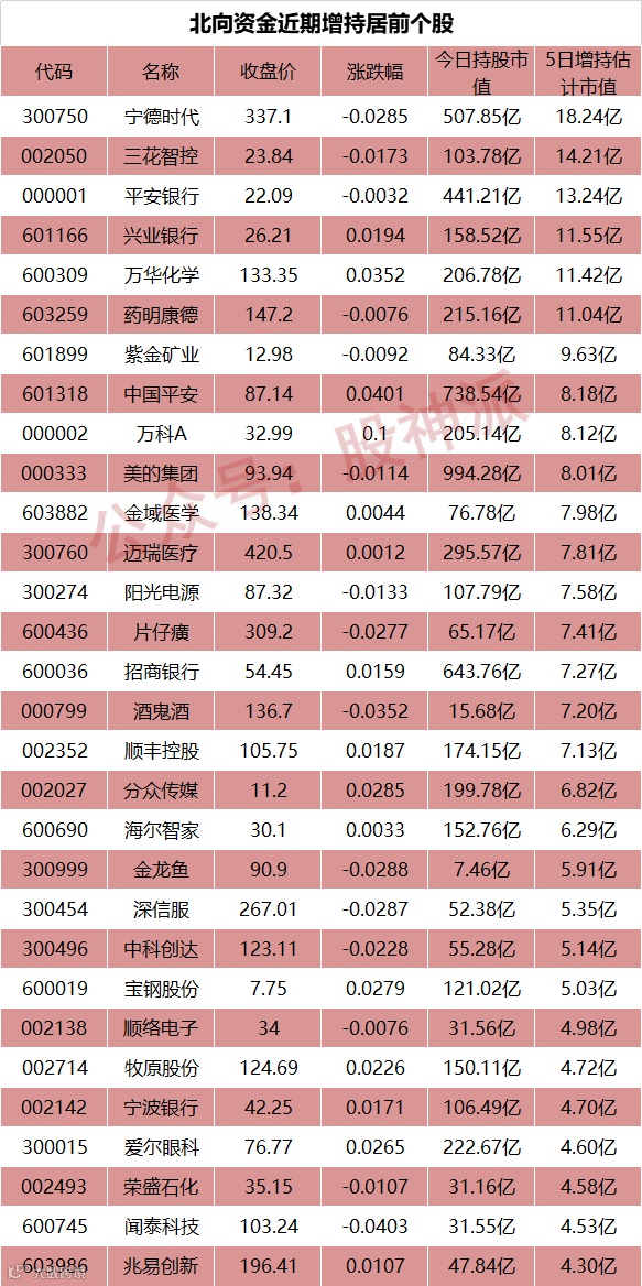个股方面,北向资金近5个交易日净流入居前的个股分别是宁德时代、三花智控、平安银行、兴业一行、万华化学、药明康德、紫金矿业、中国平安以及万科A等。其中,兴业银行、万科A、中国平安等个股估值均不足20倍。