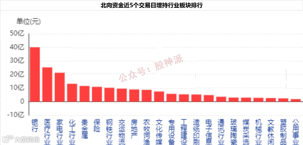 市场板块切换的同时,以“聪明资金”著称的北向资金已经在悄然调仓换股,转向部分低估值个股。股神派统计显示,近5个交易日北向资金流入居前的板块是银行、医疗行业、家电行业、化工行业、贵金属以及保险行业。