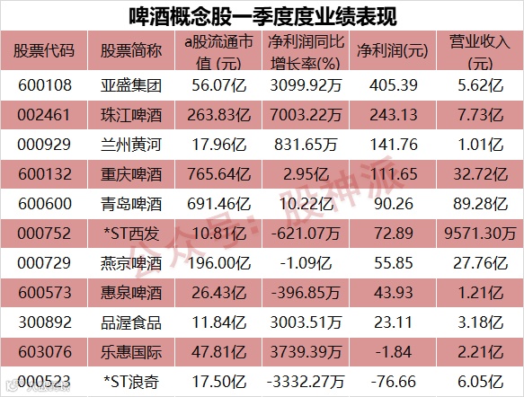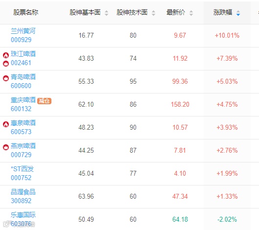 5月13日,受百威啤酒涨价引领行业消息影响,在大盘大幅下跌的情况下,A股啤酒概念持续拉升走高,截至今日收盘,兰州黄河涨停,珠江啤酒涨近8%,重庆啤酒、兰州黄河、青岛啤酒、惠泉啤酒、燕京啤酒等多股不同程度拉升上涨。