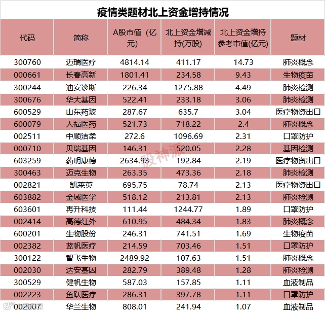 北向资金方面,按照成交均价粗略计算,12月以来疫情类题材股合计获得北上资金增持55.5亿元。21股获得北上资金增持超亿元,分别包括迈瑞医疗、长春高新、迪安诊断、华大基因、人福医药、迈克生物等。迈瑞医疗获增持金额最高,达到14.7亿元,该股月内涨幅超15%,目前市值为4780亿。