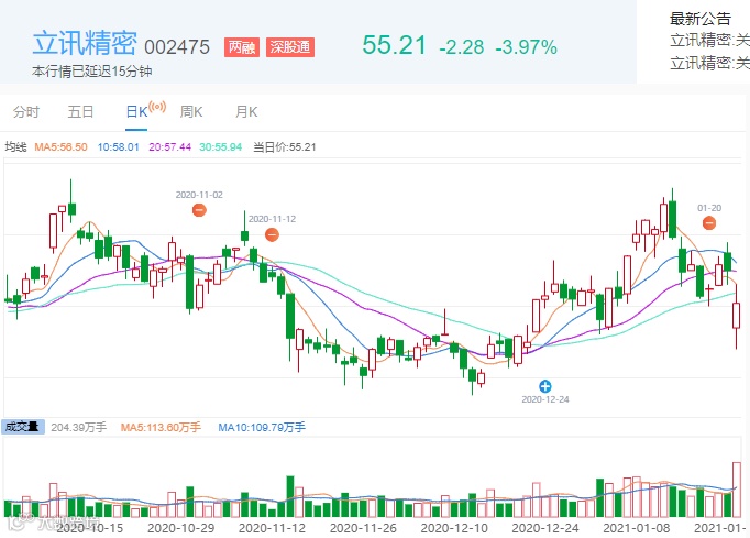 受美国337调查影响,立讯精密1月25日早盘一度跌逾9%,截至今日收盘,立讯精密股价跌3.97%报55.21元/股,总市值为3877亿元,较上一交易日蒸发超160亿元。