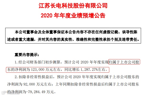 从净利润同比增长幅度的下限来看,净利润同比增幅最大的是长电科技,公司预计2020年度实现归属于上市公司股东的净利润为12.30亿元左右,同比增长1287.27%左右。