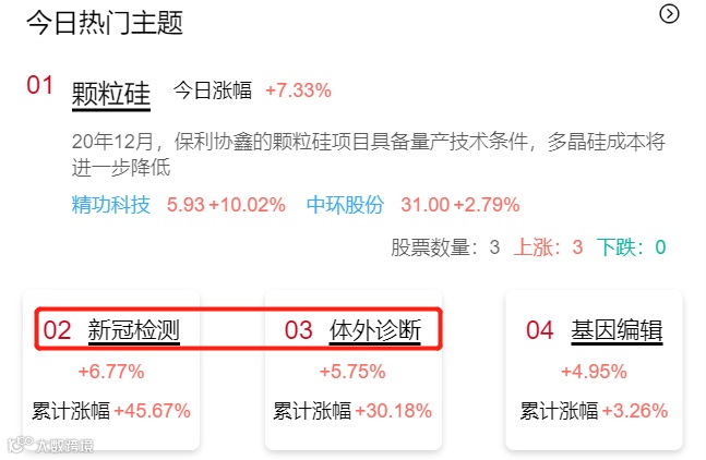 板块上今天最热的是新冠检测这个方向,这个板块昨天文章中已经讲的很清楚,春节返乡政策的实行,对于核酸检测产品的生产厂商来说,提供了百亿级别的新增市场;对于检测服务提供商来说,有千亿级别的市场增量。