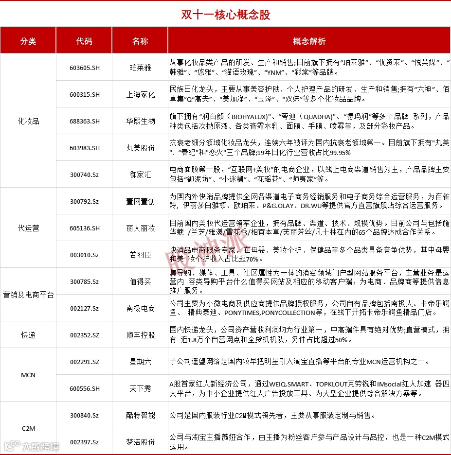 方向上来看,除了关注业绩超预期的相关个股之外,还可以关注化妆品和电商龙头这两个方向。10月21日,一年一度的“双十一之战”正式开始,当天,李佳琦和薇娅就接连登上热搜榜。市场传言称两人一晚的收入大约在6-8亿,先不管这数据是真是假,但双十一历年的炒作逻辑都是那几个。