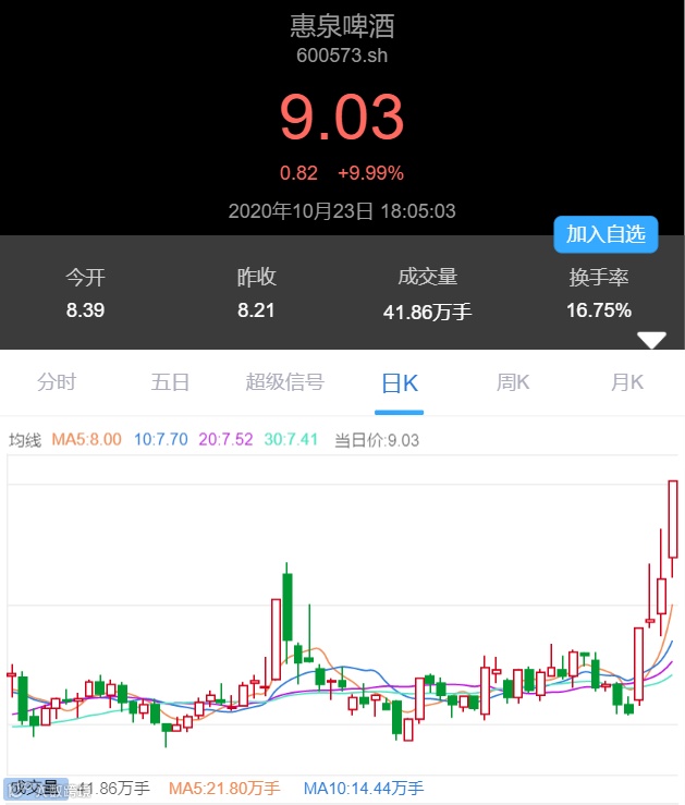 啤酒相关概念股中,惠泉啤酒直接录得涨停。公司三季报扣非净利润同比大增73%,证明了燕京体系内各公司降本增效的改革举措显著起效。看来,惠泉啤酒的未来经营还将持续改善。