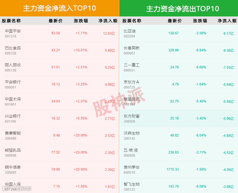 主力资金净流入前5的个股是中国平安,巴比食品,丽人丽妆,平安银行,中国太保,净流入额分别为12.93亿、5.46亿、5.25亿、4.09亿、3.43亿。主力资金净流出前5的个股是比亚迪,长春高新,三一重工,京东方A,复星医药,净流出额分别为9.17亿、8.36亿、7.03亿、5.64亿、5.58亿。
