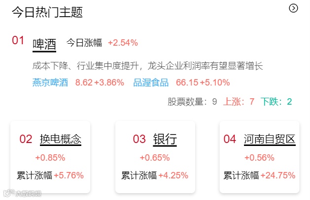 类似英飞特、惠泉啤酒、锐明技术等个股因业绩超乎市场预期而录得涨停,海洋王、美瑞新材也同样因业绩向好而逆势大涨,涨幅均在7%以上。在近期的业绩预增的相关板块中,啤酒板块因业绩超预期且九月份销量大好,成为今日最热门主题。