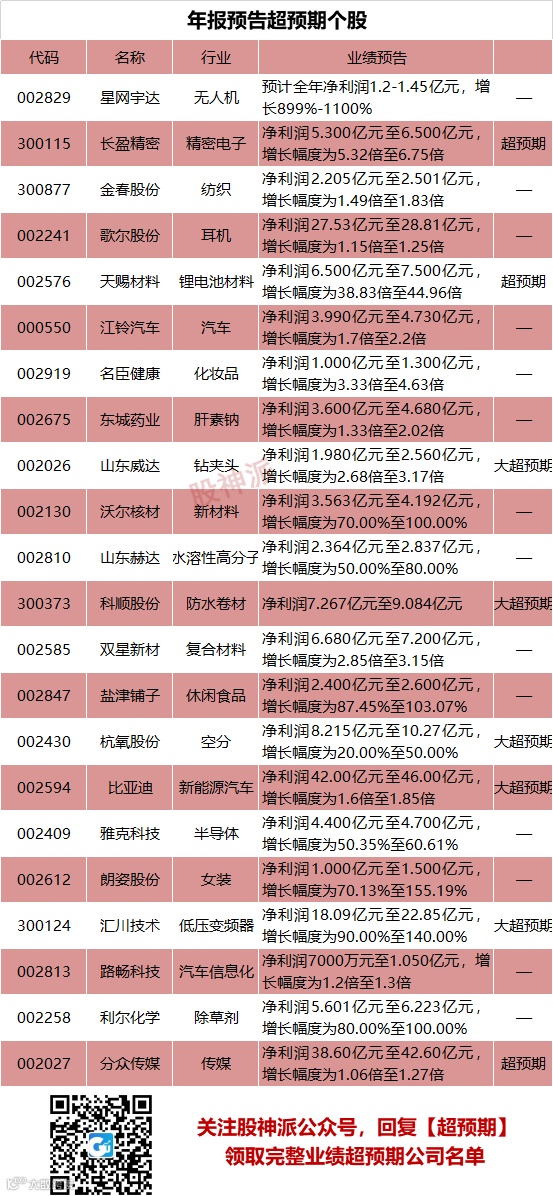 股神派整理了一份到目前为止超预期和大超预期的股票名单,股神派公众号后台留言回复【超预期】,领取完整业绩超预期公司名单。