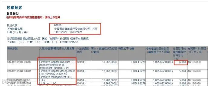 1月4日,港交所披露易显示,2020年12月18日,被称为“巴菲特接班人”的李录通过旗下的喜马拉雅资本,以平均每股4.228港元/股的价格,完成对邮储银行H股1326.2万股增持。据此计算,喜马拉雅资本此次增持总耗资约5607万港元。