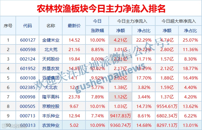 7月下旬,农业种植板块行情启动,7月17日至今,申万生物育种指数已累计大涨25%。资金面上,今日主力资金合计流入农林牧渔板块26.33亿元,其中,金健米业获主力资金净流入4.21亿元,居于两市首位,金健米业早盘涨停,封单金额超4.7亿元。北大荒、天邦股份、苏垦农发今日均获2亿元以上的主力资金净流入。