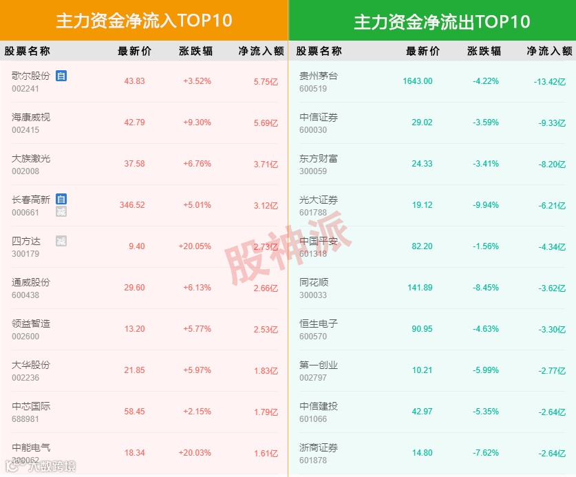 主力资金净流入前5的个股是歌尔股份,海康威视,大族激光,长春高新,四方达,净流入额分别为5.75亿、5.69亿、3.71亿、3.12亿、2.73亿。主力资金净流出前5的个股是贵州茅台,中信证券,东方财富,光大证券,中国平安,净流出额分别为13.42亿、9.33亿、8.20亿、6.21亿、4.34亿。