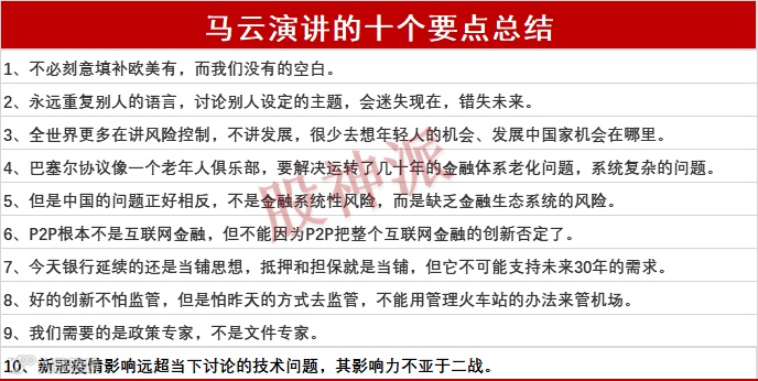 马云在外滩金融峰会上这21分钟的演讲中,先是抨击了中国的金融系统思想落伍,监管水平落后,不要老跟在西方后面学,应该向未来迈进。他认为监管分为监和管,目前中国监的水平不行,然后在管上面太用力,阻碍金融创新......