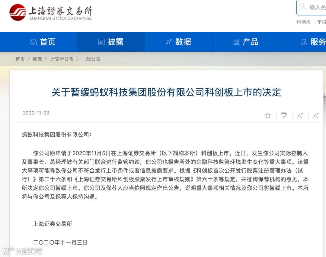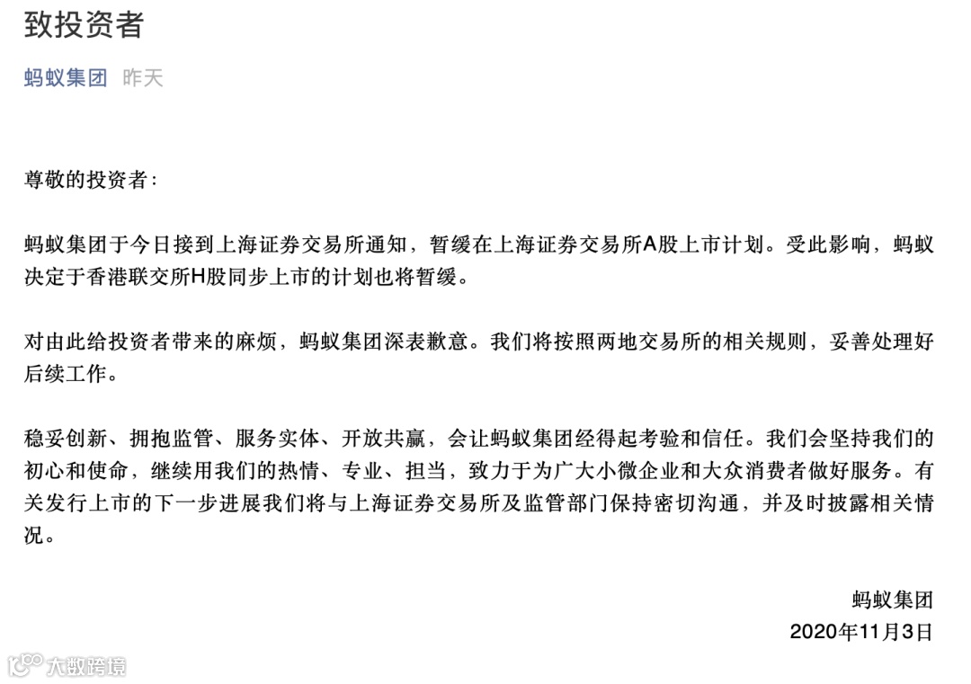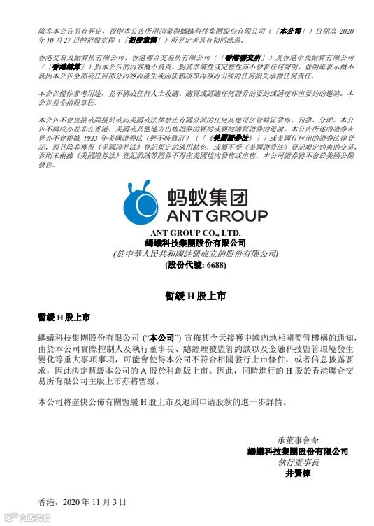 蚂蚁集团A+H股暂缓上市