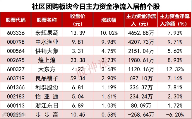 据股神派统计,截至目前A股市场上社区团购产业链上市公司已有17家。板块主力资金方面,宏辉果蔬、中水渔业主力净流入额均超4207万元,合计8860万元。
