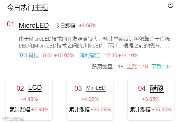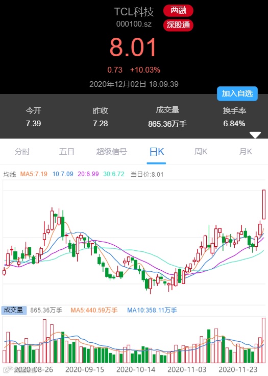 带动部分科技龙头股价急速拉升,TCL科技(净流入超13亿元)等千亿市值公司更是罕见地攻上涨停。而科技方向今天市场买的是面板和mini LED,面板这边TCL涨停创历史新高。