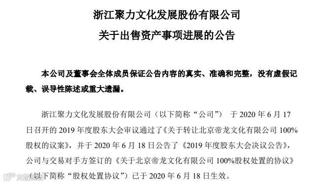 另外,*ST聚力也公告,2020 年5月18日与陆新忠(下称“受让方”)签订了《关于北京帝龙文化有限公司 100%股权处置的协议》,拟将公司持有的帝龙文化100%股权转让给受让方,此次股权转让的价格为人民币1元。