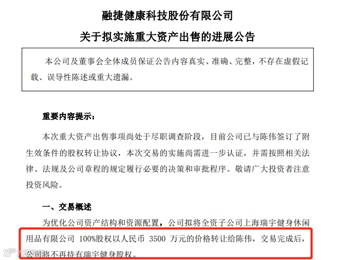 近日,融捷健康公告,拟将全资子公司瑞宇健身100%股权以人民币3500万元的价格转让给陈伟,交易完成后,公司将不再持有瑞宇健身股权。