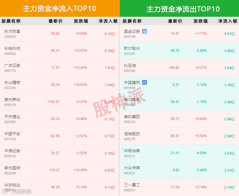主力资金净流入前5的个股是东方财富,长电科技,广发证券,东山精密,贵州茅台,净流入额分别为9.15亿、8.76亿、7.97亿、7.04亿、6.50亿。主力资金净流出前5的个股是国金证券,歌尔股份,比亚迪,中国建筑,海尔智家,净流出额分别为5.01亿、3.96亿、3.84亿、3.16亿、2.98亿。