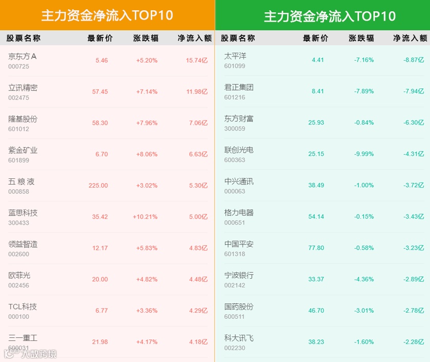 立讯精密净流入44.21亿,为个股最高,三日涨幅为14.23%。
